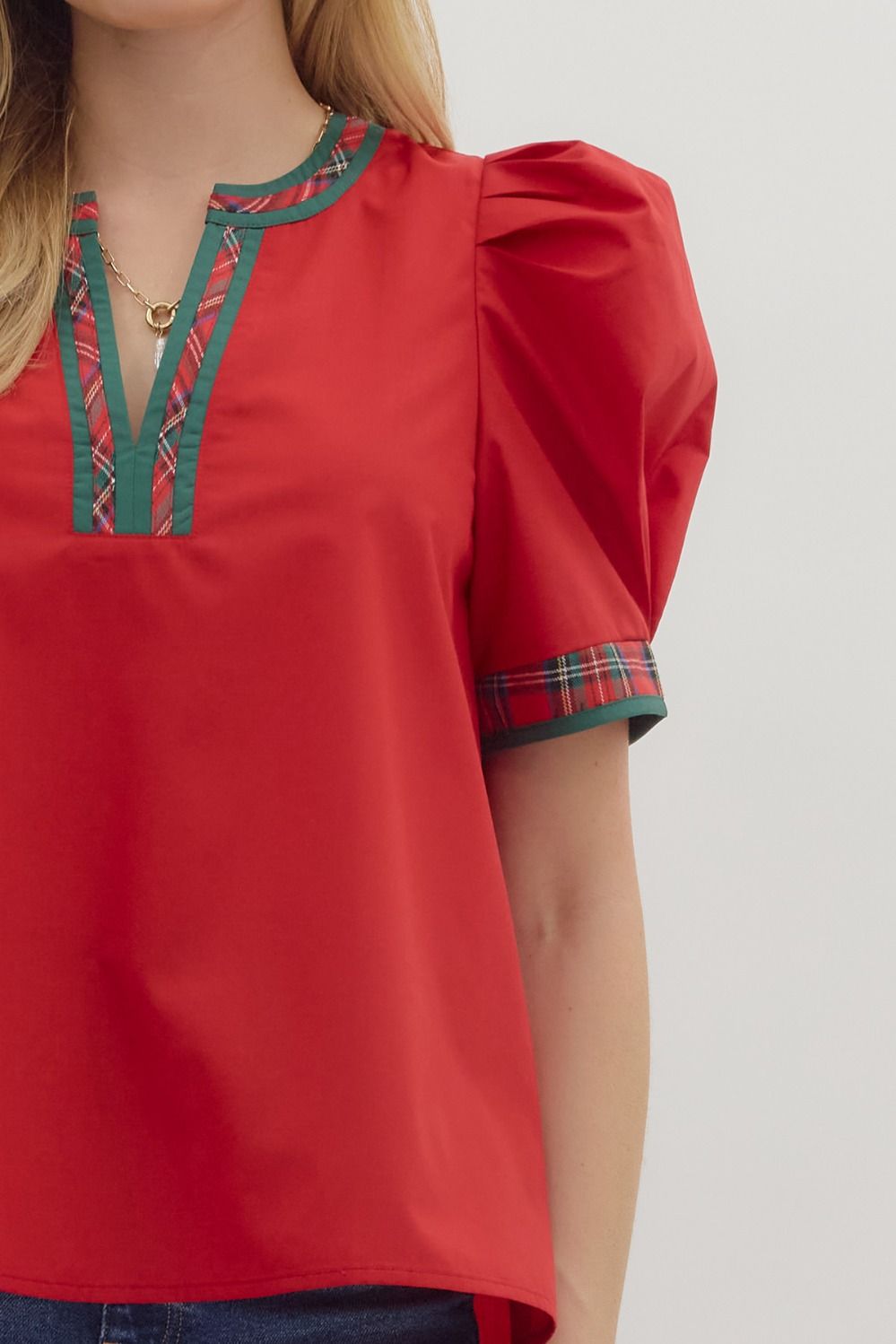 Solid short pleated puff sleeve top featuring contrast accent V-neck band. Unlined. Woven. Non-sheer. Lightweight.